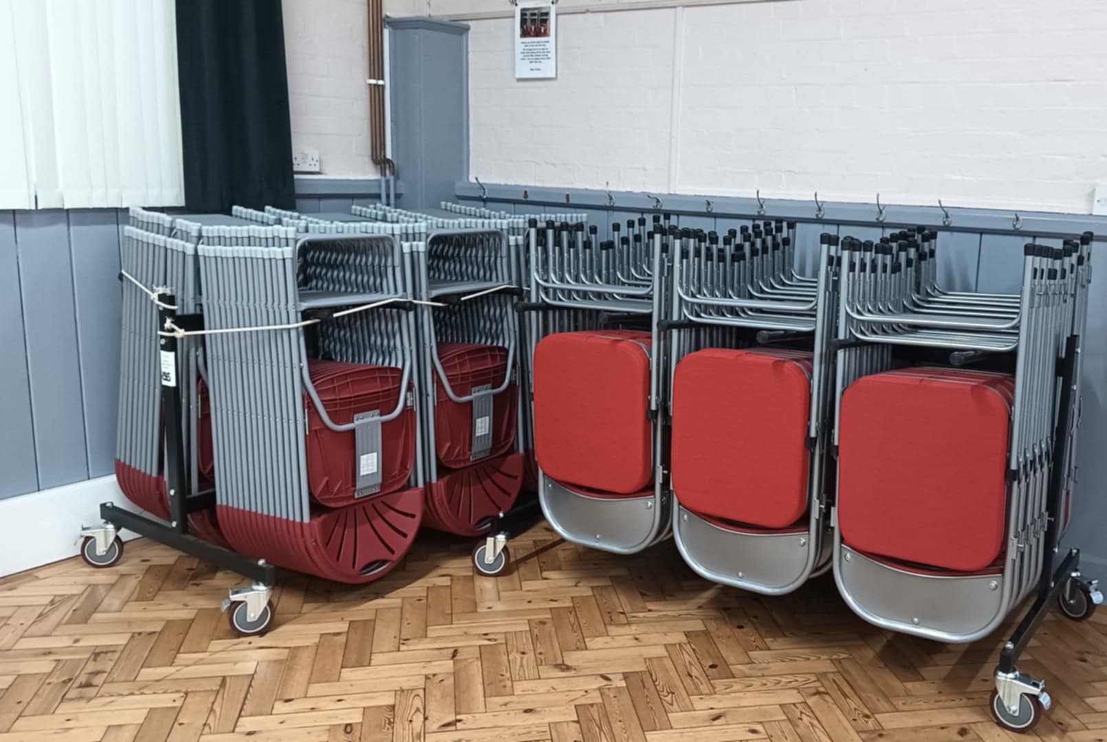 We now have folding chairs on 2 trollys, these have kindly been donated by the Parish Council and the Welcome Hall Charitable Trust